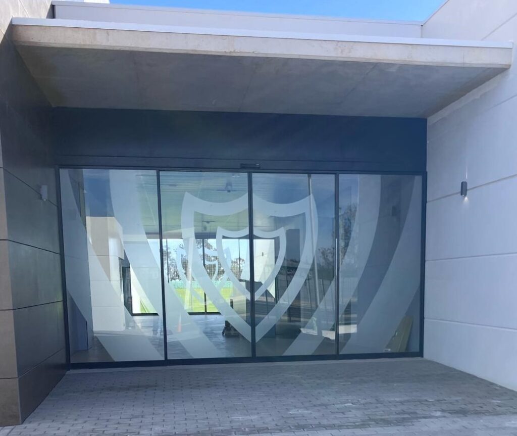 Descripción: Instalación de una impresionante puerta de cristal que se abre en forma de corredera, similar a las de las tiendas, para ofrecer un acceso moderno y elegante. Destaca por su serigrafía del borde del escudo del Málaga, aportando un toque personalizado y único. La puerta consta de cuatro hojas de cristal, con dos hojas laterales fijas y otras dos en el interior que se deslizan suavemente.