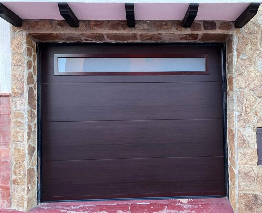 Descripción: Instalación de puerta seccional con elegante acabado imitación madera en color marrón. Destaca por su diseño estético y funcionalidad. Incluye una ventana de cristal blanco opaco en el panel superior, aportando luminosidad con privacidad.